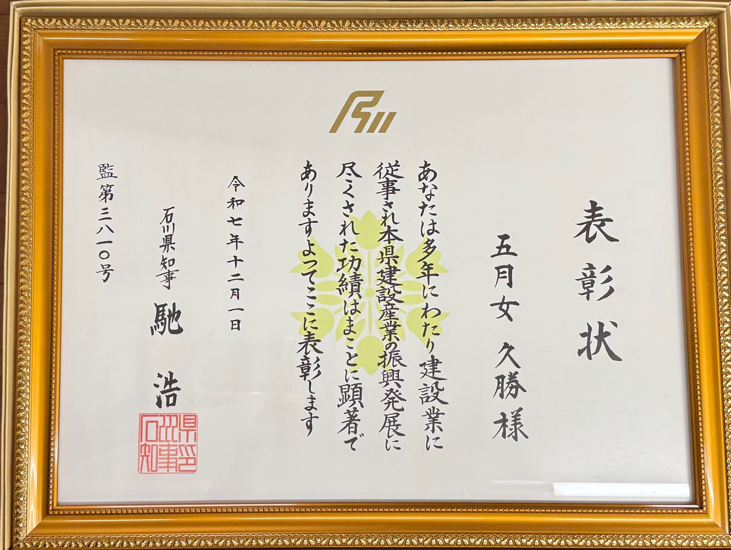 令和7年12月1日、石川県知事より弊社の代表が優良建設功労者として表彰されました。